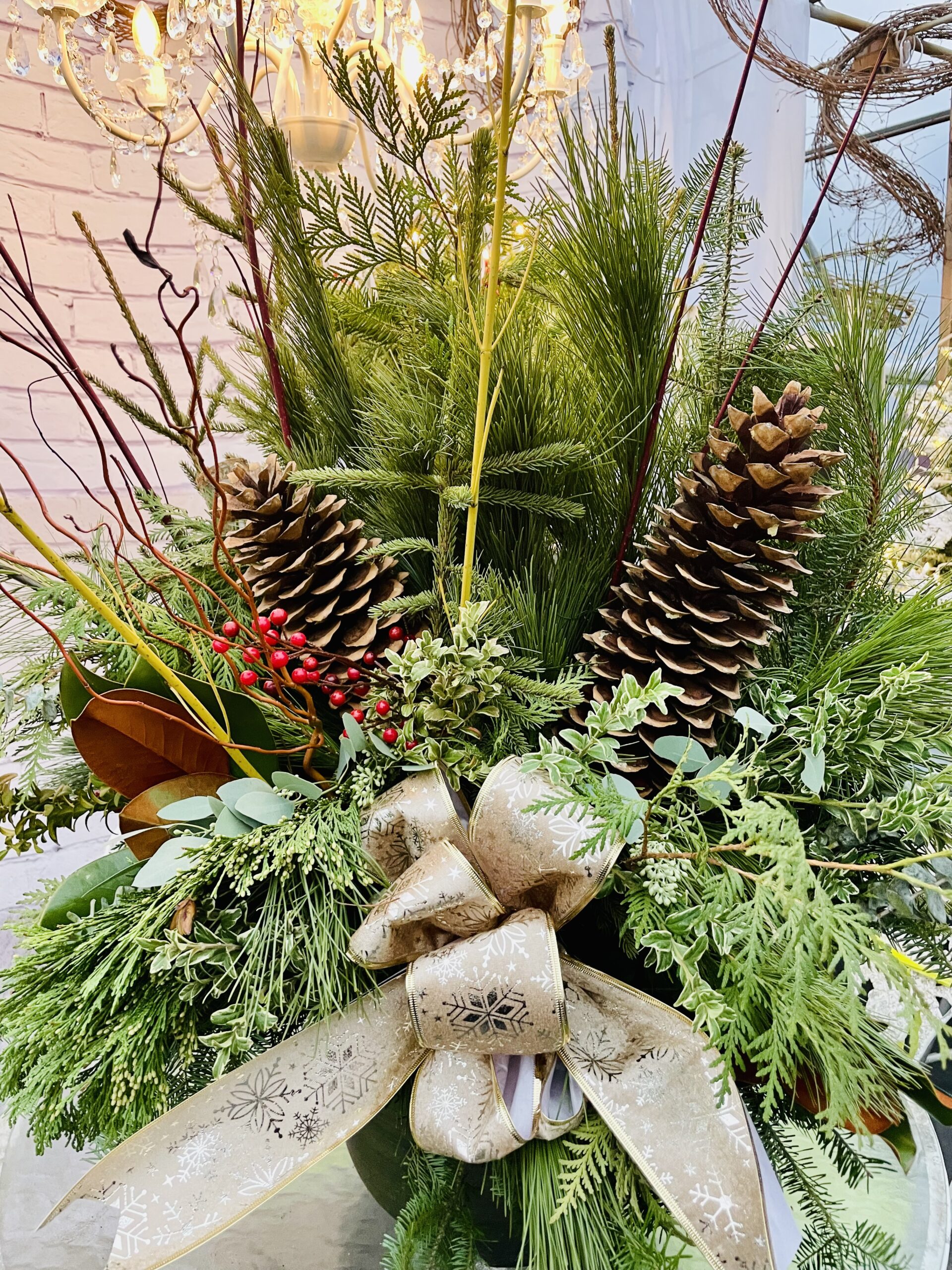 Elevate your outdoor decor with our beautiful hand-created Fresh Spruce Tip Pot, exclusively at Kelly's Cottage Garden. This stunning arrangement features vibrant red and yellow dogwood, elegant curly willow, birch branches, lush white pine and cedar, accented with pine cones and berries. Perfectly sized at 4 feet tall by 3 feet wide.